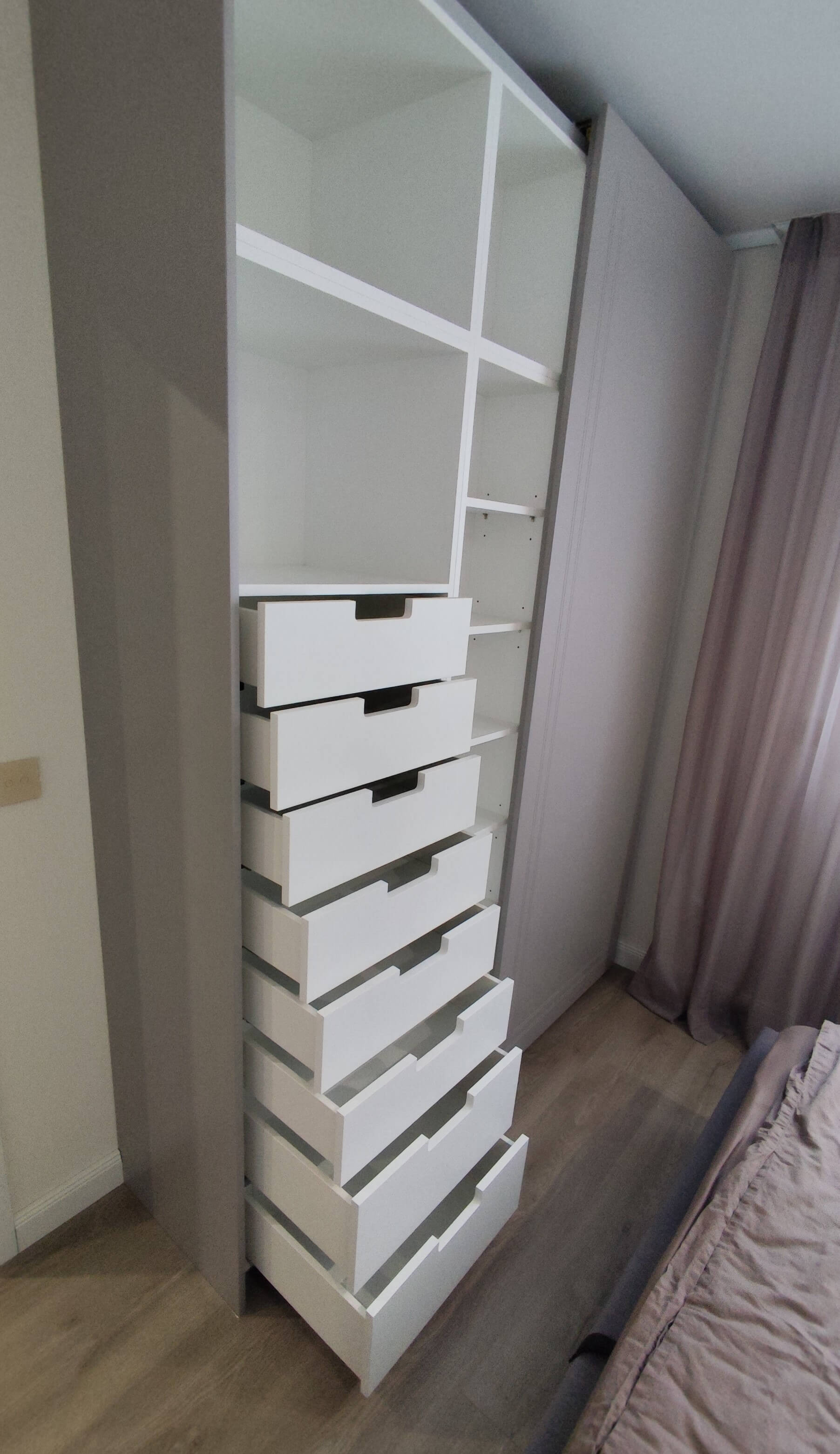 Wykonaliśmy mnóstwo różnych szaf: zabudowane, wnękowe, pokojowe, do sypialni, duże, małe, wąskie, nowoczesne, z regałem… Moglibyśmy długo wymieniać. Każda była inna i miała w sobie coś wyjątkowego. Specjalizujemy się w tworzeniu szaf na wymiar, które są równie estetyczne i eleganckie, co praktyczne i ergonomiczne. Z niektórymi modelami zapoznać się poniżej!